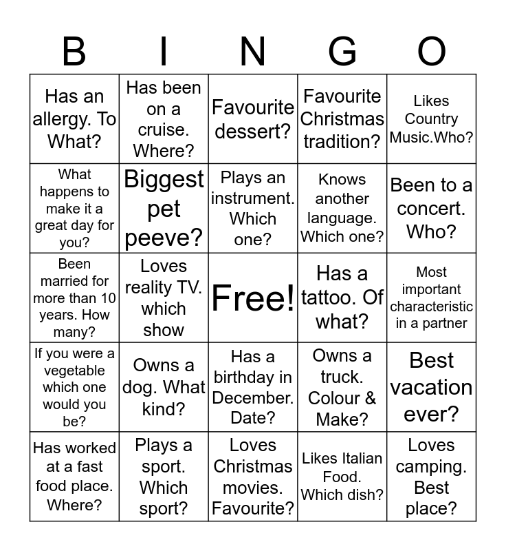 This bingo card has a free space and 24 words: Owns a dog. What kind?, Plays a sport. Which sport?, Plays an instrument. Which one?, Has worked at a fast food place. Where?, Likes Country Music.Who?, Has an allergy. To What?, What happens to make it a great day for you?, Has been on a cruise. Where?, Has a tattoo. Of what?, Has a birthday in December. Date?, Knows another language. Which one?, Been married for more than 10 years. How many?, Owns a truck. Colour & Make?, Best vacation ever?, Biggest pet peeve?, Likes Italian Food. Which dish?, Most important characteristic in a partner, Favourite dessert?, Been to a concert. Who?, Loves reality TV. which show, Loves camping. Best place?, If you were a vegetable which one would you be?, Favourite Christmas tradition? and Loves Christmas movies. Favourite?.