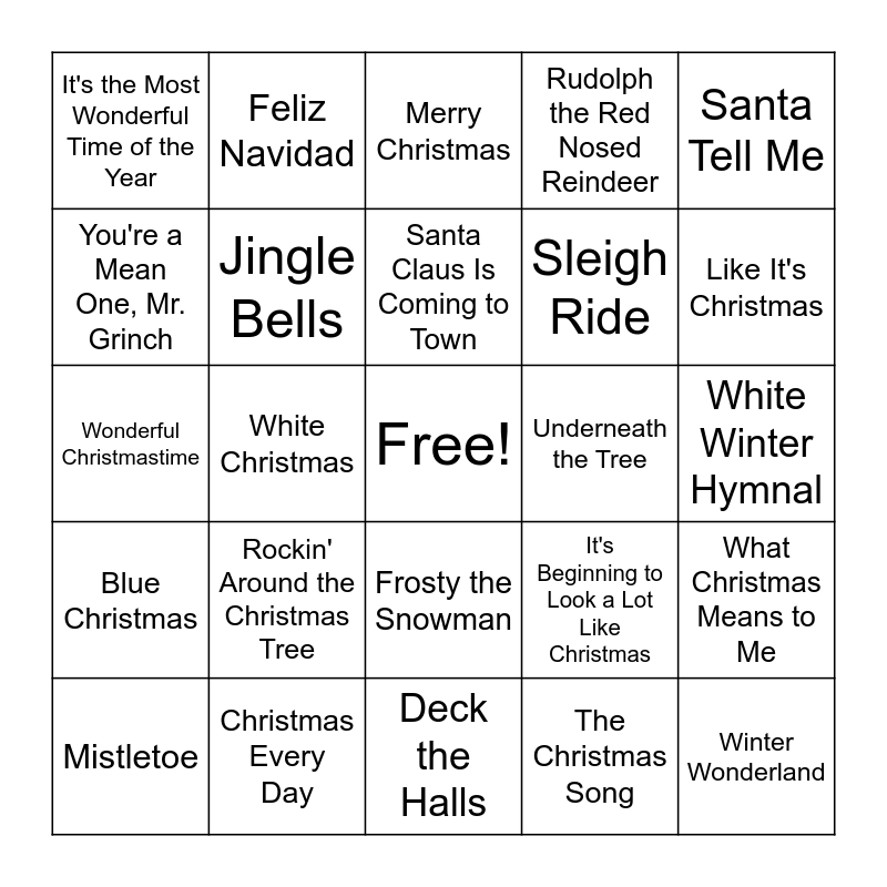 This bingo card has a free space and 35 words: Snowman, Candy Cane Lane, Jingle Bell Rock, Jingle Bells, Frosty the Snowman, Rudolph the Red Nosed Reindeer, You're a Mean One, Mr. Grinch, All I Want for Christmas Is You, Santa Claus Is Coming to Town, Last Christmas, Wonderful Christmastime, Santa Tell Me, I Want a Hippopotamus for Christmas, All I Want for Christmas is My Two Front Teeth, It's the Most Wonderful Time of the Year, Underneath the Tree, The Christmas Song, White Christmas, Blue Christmas, Winter Wonderland, It's Beginning to Look a Lot Like Christmas, Mistletoe, What Christmas Means to Me, Christmas Every Day, Merry Christmas, Like It's Christmas, Wrapped in Red, A Holly Jolly Christmas, Sleigh Ride, White Winter Hymnal, Good to be Bad, Deck the Halls, Rockin' Around the Christmas Tree, Feliz Navidad and Mary's Boy Child.