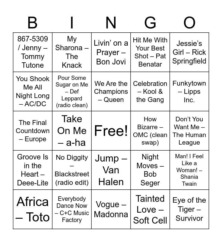 This bingo card has a free space and 75 words: Don’t Stop Believin’ – Journey, Sweet Caroline – Neil Diamond, Livin’ on a Prayer – Bon Jovi, Billie Jean – Michael Jackson, Dancing Queen – ABBA, Don’t Stop ’Til You Get Enough – Michael Jackson, I Wanna Dance with Somebody – Whitney Houston, Sweet Home Alabama – Lynyrd Skynyrd, September – Earth, Wind & Fire, Brown Eyed Girl – Van Morrison, Bohemian Rhapsody – Queen, We Will Rock You – Queen, We Are the Champions – Queen, You Shook Me All Night Long – AC/DC, Hotel California – Eagles, Take On Me – a-ha, Footloose – Kenny Loggins, Eye of the Tiger – Survivor, Come On Eileen – Dexys Midnight Runners, Jessie’s Girl – Rick Springfield, Summer of ’69 – Bryan Adams, The Final Countdown – Europe, Pour Some Sugar on Me – Def Leppard (radio clean), My Sharona – The Knack, Hit Me With Your Best Shot – Pat Benatar, Girls Just Want to Have Fun – Cyndi Lauper, Beat It – Michael Jackson, Like a Virgin – Madonna, Uptown Girl – Billy Joel, You May Be Right – Billy Joel, American Girl – Tom Petty, Free Fallin’ – Tom Petty, Old Time Rock & Roll – Bob Seger, Night Moves – Bob Seger, Funkytown – Lipps Inc., Celebration – Kool & the Gang, Superstition – Stevie Wonder, I Love Rock ’n Roll – Joan Jett & the Blackhearts, Don’t You Want Me – The Human League, Tainted Love – Soft Cell, Walking on Sunshine – Katrina & the Waves, Dr. Feelgood – Mötley Crüe (clean, safer swap), Love Shack – The B-52’s, Take Me Home Tonight – Eddie Money, Hungry Like the Wolf – Duran Duran, Everybody Wants to Rule the World – Tears for Fears, Africa – Toto, 867-5309 / Jenny – Tommy Tutone, Karma Chameleon – Culture Club, Faith – George Michael, Let’s Dance – David Bowie, Jump – Van Halen, Panama – Van Halen, The Power of Love – Huey Lewis & the News, Centerfold – The J. Geils Band, Don’t You (Forget About Me) – Simple Minds, You Spin Me Round (Like a Record) – Dead or Alive, Let’s Groove – Earth, Wind & Fire (clean swap), Walk This Way – Run-D.M.C. & Aerosmith (clean), Ice Ice Baby – Vanilla Ice, No Diggity – Blackstreet (radio edit), Wannabe – Spice Girls, Smells Like Teen Spirit – Nirvana, Basket Case – Green Day (clean), All the Small Things – Blink-182, How Bizarre – OMC (clean swap), Closing Time – Semisonic, Wonderwall – Oasis, Torn – Natalie Imbruglia, Man! I Feel Like a Woman! – Shania Twain, Groove Is in the Heart – Deee-Lite, Everybody Dance Now – C+C Music Factory, U Can’t Touch This – MC Hammer, Vogue – Madonna and Friends in Low Places – Garth Brooks.