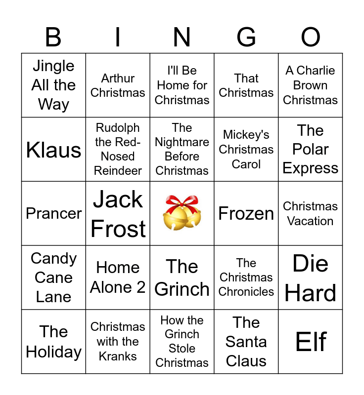 This bingo card has a free space and 29 words: The Holiday, Home Alone, Jack Frost, Frosty the Snowman, Jingle All the Way, I'll Be Home for Christmas, Rudolph the Red-Nosed Reindeer, Home Alone 2, Frozen, Christmas with the Kranks, Christmas Vacation, Elf, How the Grinch Stole Christmas, The Santa Claus, The Polar Express, A Christmas Story, The Grinch, Candy Cane Lane, A Charlie Brown Christmas, Prancer, The Christmas Chronicles, The Muppets Christmas Carol, Mickey's Christmas Carol, Klaus, That Christmas, Arthur Christmas, Die Hard, The Nightmare Before Christmas and Mickey's Once Upon a Christmas.