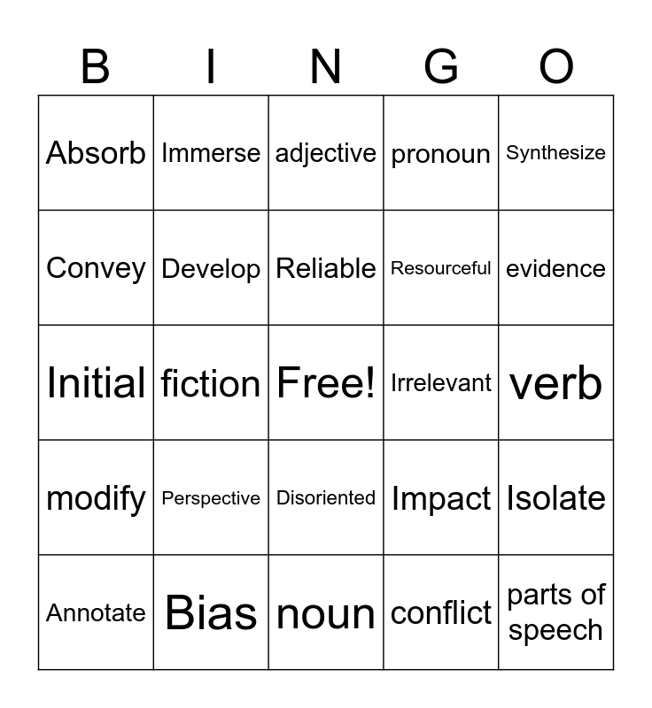 This bingo card has a free space and 24 words: Perspective, Bias, Reliable, Annotate, Synthesize, Absorb, Convey, Immerse, Irrelevant, Disoriented, Resourceful, Initial, Impact, Isolate, Develop, conflict, verb, adjective, evidence, fiction, parts of speech, modify, pronoun and noun.