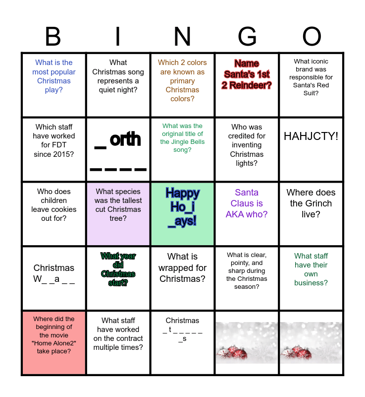This bingo card has 2 images, a free space and 23 words: What year did Christmas start?, Christmas _ t _ _ _ _ _ _s, What was the original title of the Jingle Bells song?, Where did the beginning of the movie "Home Alone2" take place?, What iconic brand was responsible for Santa's Red Suit?, What is the most popular Christmas play?, Which staff have worked for FDT since 2015?, What Christmas song represents a quiet night?, Santa Claus is AKA who?, What is wrapped for Christmas?, Who was credited for inventing Christmas lights?, Who does children leave cookies out for?, What is clear, pointy, and sharp during the Christmas season?, What staff have their own business?, _ orth _ _ _ _, What country provides the Iconic Christmas Tree in Trafalgar Square annually?, Where does the Grinch live?, Which 2 colors are known as primary Christmas colors?, HAHJCTY!, What species was the tallest cut Christmas tree?, What staff have worked on the contract multiple times?, Christmas W_ _a _ _ and Name Santa's 1st 2 Reindeer?.