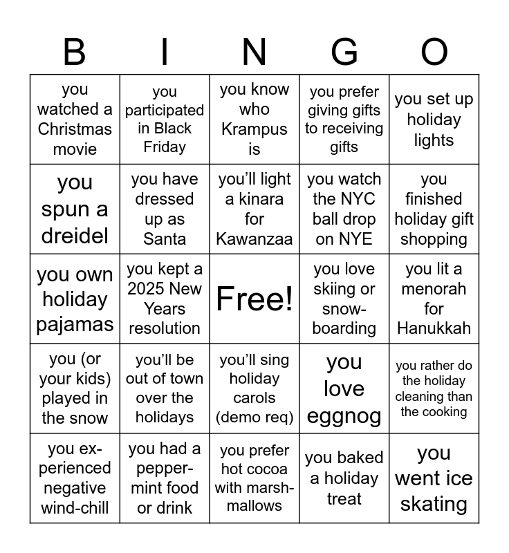 This bingo card has a free space and 24 words: you’ll be out of town over the holidays, you had a pepper-mint food or drink, you’ll light a kinara for Kawanzaa, you ex-perienced negative wind-chill, you set up holiday lights, you watched a Christmas movie, you spun a dreidel, you participated in Black Friday, you love skiing or snow-boarding, you’ll sing holiday carols (demo req), you watch the NYC ball drop on NYE, you own holiday pajamas, you love eggnog, you rather do the holiday cleaning than the cooking, you have dressed up as Santa, you baked a holiday treat, you lit a menorah for Hanukkah, you know who Krampus is, you finished holiday gift shopping, you kept a 2025 New Years resolution, you went ice skating, you (or your kids) played in the snow, you prefer giving gifts to receiving gifts and you prefer hot cocoa with marsh-mallows.