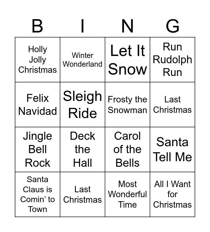 This bingo card has 16 words: Last Christmas, Santa Tell Me, Let It Snow, Holly Jolly Christmas, Jingle Bell Rock, Winter Wonderland, Carol of the Bells, Most Wonderful Time, Felix Navidad, Sleigh Ride, Santa Claus is Comin’ to Town, Run Rudolph Run, Deck the Hall, Last Christmas, Frosty the Snowman and All I Want for Christmas.
