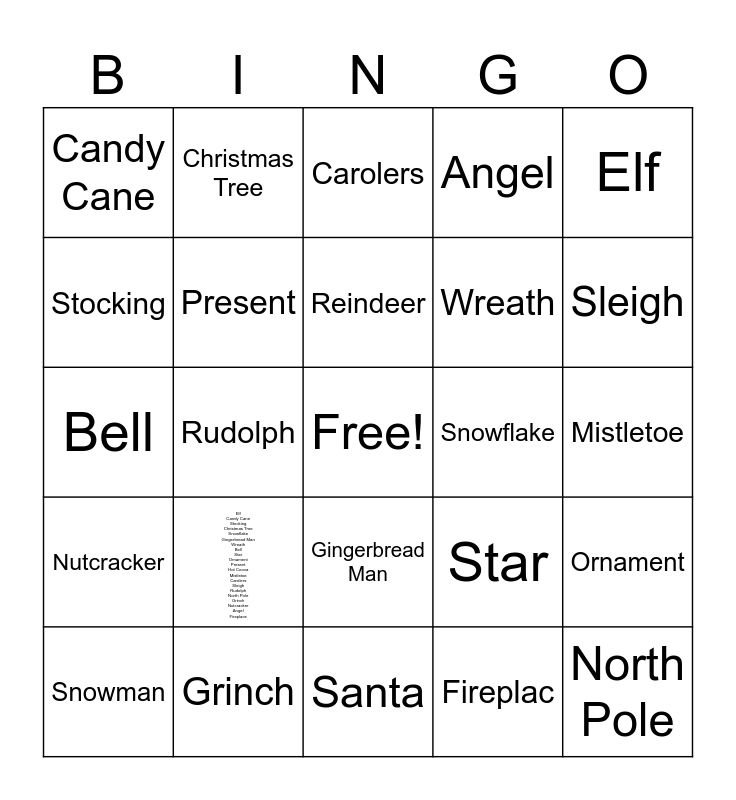 This bingo card has a free space and 25 words: Elf Candy Cane Stocking Christmas Tree Snowflake Gingerbread Man Wreath Bell Star Ornament Present Hot Cocoa Mistletoe Carolers Sleigh Rudolph North Pole Grinch Nutcracker Angel Fireplace, Santa, Reindeer, Snowman, Elf, Candy Cane, Stocking, Christmas Tree, Snowflake, Gingerbread Man, Wreath, Bell, Star, Ornament, Present, Hot Cocoa, Mistletoe, Carolers, Sleigh, Rudolph, North Pole, Grinch, Nutcracker, Angel and Fireplac.