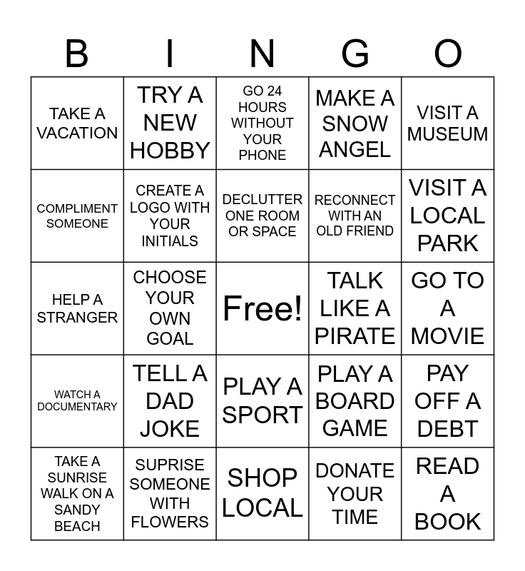 This bingo card has a free space and 29 words: TAKE A SUNRISE WALK ON A SANDY BEACH, GET A NEW PET, CHOOSE YOUR OWN GOAL, PAY IT FORWARD, TAKE A VACATION, GO 24 HOURS WITHOUT YOUR PHONE, CREATE A LOGO WITH YOUR INITIALS, TELL A DAD JOKE, TALK LIKE A PIRATE, SUPRISE SOMEONE WITH FLOWERS, GO TO A MOVIE, READ A BOOK, SHOP LOCAL, DONATE YOUR TIME, VISIT A LOCAL PARK, HAVE A PICNIC, PLAY A SPORT, WATCH A DOCUMENTARY, VISIT A MUSEUM, HELP A STRANGER, PLAY A BOARD GAME, FIX SOMETHING, RECONNECT WITH AN OLD FRIEND, COMPLIMENT SOMEONE, MAKE A SNOW ANGEL, TRY A NEW HOBBY, PAY OFF A DEBT, DECLUTTER ONE ROOM OR SPACE and CLEAN UP YARD.