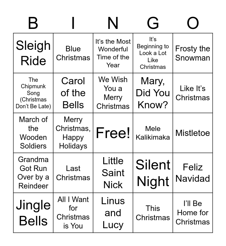 This bingo card has a free space and 30 words: All I Want for Christmas is You, Dominick the Donkey, Merry Christmas, Happy Holidays, Underneath the Tree, Sleigh Ride, It’s the Most Wonderful Time of the Year, Carol of the Bells, Little Saint Nick, Mele Kalikimaka, Linus and Lucy, Mistletoe, I’ll Be Home for Christmas, This Christmas, You’re a Mean One Mr. Grinch, Like It’s Christmas, The 12 Days of Christmas, Silent Night, Grandma Got Run Over by a Reindeer, Last Christmas, Frosty the Snowman, March of the Wooden Soldiers, I Want a Hippopotamus for Christmas, Blue Christmas, Mary, Did You Know?, The Chipmunk Song (Christmas Don’t Be Late), It’s Beginning to Look a Lot Like Christmas, Feliz Navidad, Jingle Bells, We Wish You a Merry Christmas and That’s Christmas to Me.
