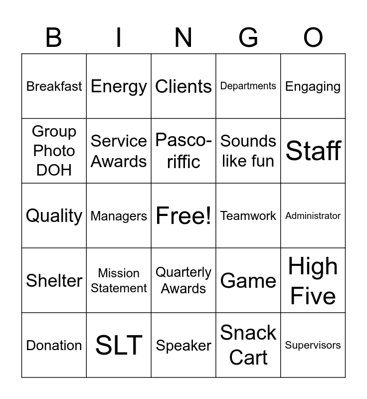 This bingo card has a free space and 24 words: Mission Statement, SLT, Pasco-riffic, Donation, Engaging, Breakfast, Group Photo DOH, Energy, Teamwork, Quarterly Awards, Sounds like fun, Quality, Game, High Five, Service Awards, Snack Cart, Administrator, Clients, Staff, Managers, Supervisors, Shelter, Departments and Speaker.