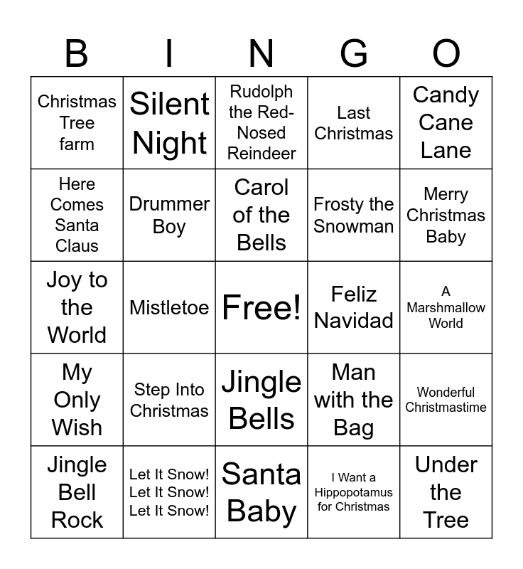 This bingo card has a free space and 29 words: Jingle Bell Rock, Like it's Christmas, Mistletoe, The Chipmunk Song, Christmas Tree farm, Rudolph the Red-Nosed Reindeer, Drummer Boy, Step Into Christmas, Feliz Navidad, Let It Snow! Let It Snow! Let It Snow!, A Marshmallow World, Under the Tree, Santa Baby, I Want a Hippopotamus for Christmas, Merry Christmas Baby, It Feels like Christmas, Jingle Bells, My Only Wish, Candy Cane Lane, Joy to the World, Man with the Bag, Snowman, Frosty the Snowman, Here Comes Santa Claus, Last Christmas, Silent Night, Wonderful Christmastime, Carol of the Bells and The Chanukah Song.