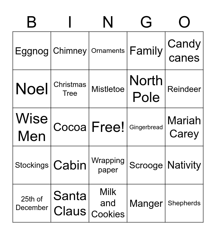 This bingo card has a free space and 59 words: Merry Christmas, Santa Claus, Elves, Stockings, Manger, Jesus, Christmas Tree, Wreath, North Pole, Rudolph, Family, Sleigh, Noel, Jingle BellsAngel, Silent Night, Eggnog, Shepherds, Candy canes, Lights, Mistletoe, Gingerbread, Ornaments, 25th of December, Nativity, Presents, Bow, Snowflake, Mrs.Claus, Reindeer, Grinch, Snow, Humbug, Chestnut, Goose, Chimney, Frosty the Snowman, Blizzard, Cocoa, Fireplace, Wise Men, Toy Makers, Cabin, Mariah Carey, Christmas Eve, Snow angel, Caroling, Holly, Snoopy and Woodstock, Wrapping paper, Milk and Cookies, Candy Canes, Garland, Sled, Yulelog, Workshop, Scrooge, Snowman, Lights and Fireplace.