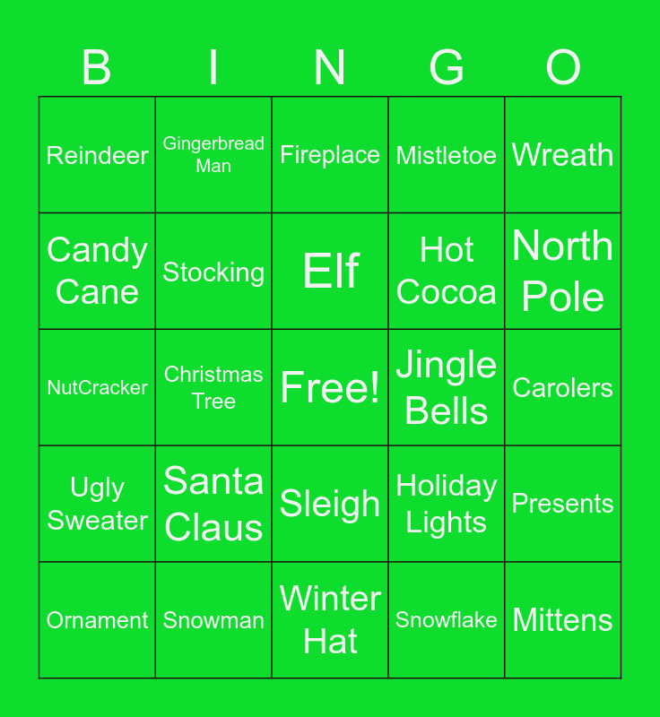 This bingo card has a free space and 24 words: Santa Claus, Snowman, Elf, Ornament, Wreath, Reindeer, Candy Cane, Gingerbread Man, Jingle Bells, Sleigh, Hot Cocoa, NutCracker, Holiday Lights, Presents, Stocking, Snowflake, Carolers, Fireplace, North Pole, Christmas Tree, Mittens, Ugly Sweater, Mistletoe and Winter Hat.