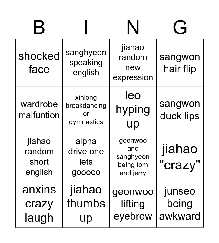 This bingo card has 16 words: jiahao thumbs up, jiahao "crazy", jiahao random new expression, shocked face, jiahao random short english, sanghyeon speaking english, geonwoo and sanghyeon being tom and jerry, geonwoo lifting eyebrow, wardrobe malfuntion, xinlong breakdancing or gymnastics, anxins crazy laugh, sangwon hair flip, alpha drive one lets gooooo, sangwon duck lips, leo hyping up and junseo being awkward.