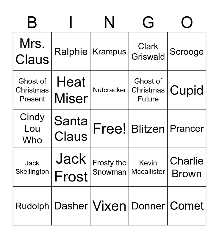 This bingo card has a free space and 29 words: Rudolph, Buddy the Elf, Santa Claus, Elf on the Shelf, Mrs. Claus, Krampus, Heat Miser, Jack Frost, Blitzen, Dasher, Prancer, Comet, Vixen, Donner, Cupid, The Grinch, Frosty the Snowman, Jack Skellington, Scrooge, Cindy Lou Who, Kevin Mccallister, Ghost of Christmas Past, Ghost of Christmas Future, Ghost of Christmas Present, Clark Griswald, Ralphie, Charlie Brown, Nutcracker and Father Christmas.