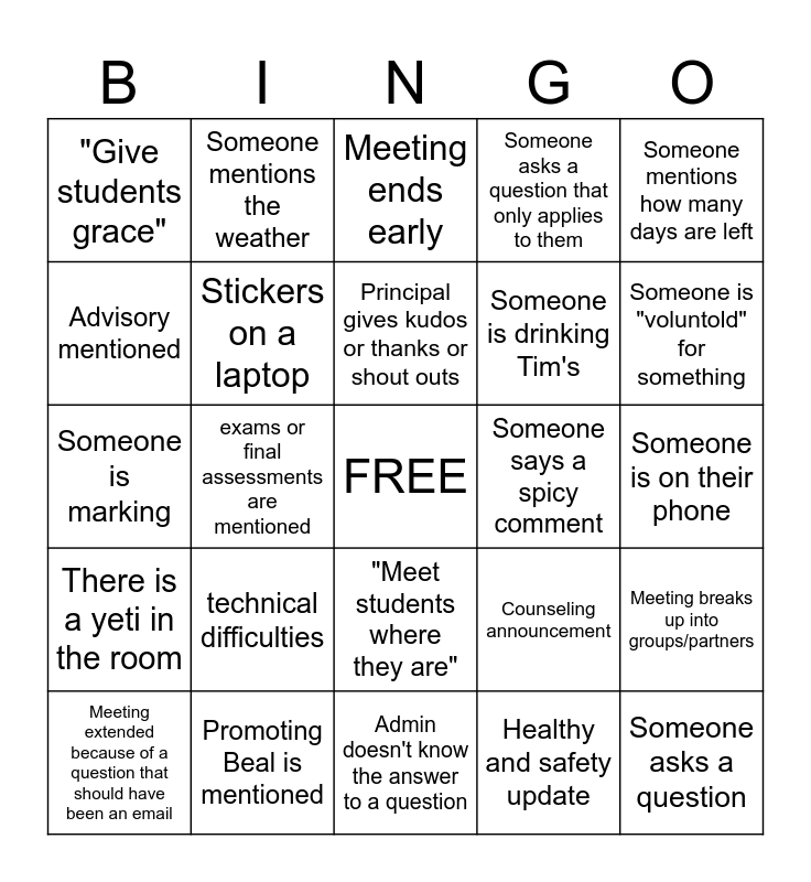 This bingo card has a free space and 41 words: Someone arrives late, Someone is marking, Someone is eating, Stickers on a laptop, Promoting Beal is mentioned, "Meet students where they are", Principal gives kudos or thanks or shout outs, Assistant principal restates what principal said, Someone mentions how many days are left, There is a yeti in the room, exams or final assessments are mentioned, Someone asks a question that only applies to them, Someone asks a question, Someone is on their phone, Someone says a spicy comment, technical difficulties, The meeting could have been an email, "Give students grace", Meeting runs late, Meeting ends early, Meeting breaks up into groups/partners, Someone asks a question that was already asked, Admin doesn't know the answer to a question, Someone is drinking Tim's, Someone complains about phones in class, Testing is discussed, Healthy and safety update, Teacher self-care care is mentioned, Someone is "voluntold" for something, Admin makes a joke, Someone sneezes or coughs, Someone mentions the weather, Meeting extended because of a question that should have been an email, DATA, Counseling announcement, Advisory mentioned, Not a question, but a comment, Someone rolls their eyes, Outlook email ding, A coworker texts you about the meeting during the meeting and Union update.