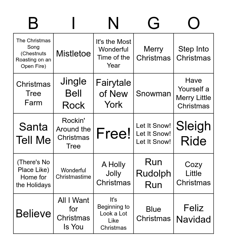 This bingo card has a free space and 30 words: All I Want for Christmas Is You, Last Christmas, Rockin' Around the Christmas Tree, White Christmas, The Christmas Song (Chestnuts Roasting on an Open Fire), It's the Most Wonderful Time of the Year, Jingle Bell Rock, A Holly Jolly Christmas, Let It Snow! Let It Snow! Let It Snow!, It's Beginning to Look a Lot Like Christmas, Sleigh Ride, Feliz Navidad, Blue Christmas, Santa Baby, Have Yourself a Merry Little Christmas, Rudolph the Red-Nosed Reindeer, Run Rudolph Run, (There's No Place Like) Home for the Holidays, Wonderful Christmastime, Step Into Christmas, Santa Tell Me, Underneath the Tree, Mistletoe, Snowman, Christmas Tree Farm, Merry Christmas, Cozy Little Christmas, Believe, Fairytale of New York and Do They Know It's Christmas?.