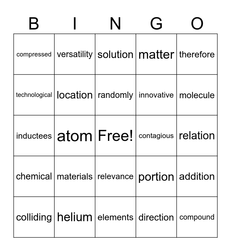 This bingo card has a free space and 24 words: materials, helium, randomly, colliding, therefore, compressed, technological, versatility, contagious, relevance, innovative, inductees, portion, addition, location, direction, relation, solution, molecule, atom, compound, chemical, matter and elements.