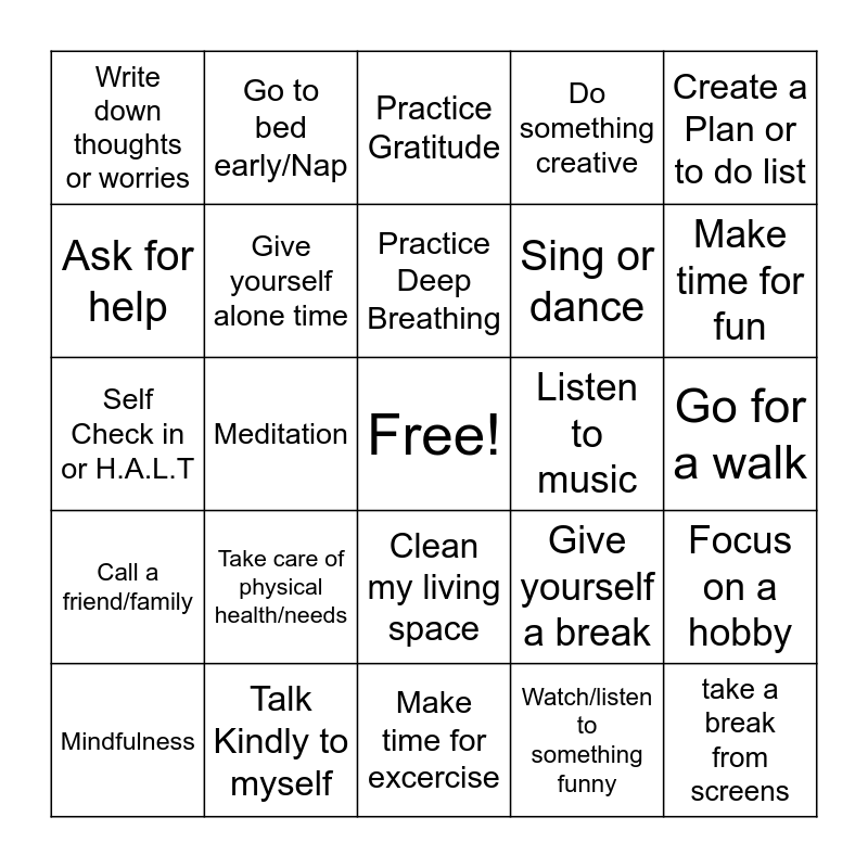 This bingo card has a free space and 24 words: Mindfulness, Take care of physical health/needs, Practice Deep Breathing, Watch/listen to something funny, Create a Plan or to do list, Write down thoughts or worries, Go to bed early/Nap, Practice Gratitude, Listen to music, Go for a walk, Self Check in or H.A.L.T, Give yourself alone time, Give yourself a break, Focus on a hobby, Ask for help, Talk Kindly to myself, Make time for excercise, Do something creative, Make time for fun, Call a friend/family, Meditation, Clean my living space, Sing or dance and take a break from screens.
