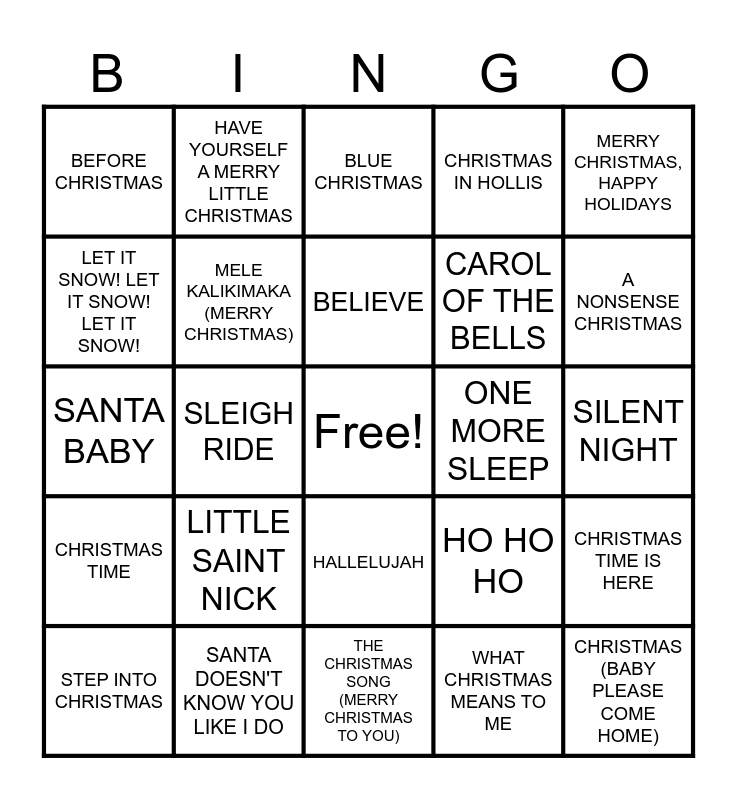 This bingo card has a free space and 75 words: ROCKIN' AROUND THE CHRISTMAS TREE, WHITE CHRISTMAS, BLUE CHRISTMAS, A HOLLY JOLLY CHRISTMAS, FELIZ NAVIDAD, YOU'RE A MEAN ONE, MR GRINCH, SNOWMAN, SANTA TELL ME, MISTLETOE, UNDERNEATH THE TREE, LAST CHRISTMAS, JINGLE BELL ROCK, BELIEVE, LET IT SNOW! LET IT SNOW! LET IT SNOW!, IT'S THE MOST WONDERFUL TIME OF THE YEAR, SLEIGH RIDE, RUN RUDOLPH RUN, CHRISTMAS (BABY PLEASE COME HOME), LIKE IT'S CHRISTMAS, MERRY CHRISTMAS, HAPPY HOLIDAYS, CANDY CANE LANE, SANTA BABY, MELE KALIKIMAKA (MERRY CHRISTMAS), HAVE YOURSELF A MERRY LITTLE CHRISTMAS, CHRISTMAS IN HOLLIS, I WANT A HIPPOPOTAMUS FOR CHRISTMAS, PLEASE COME HOME FOR CHRISTMAS, BABY IT'S COLD OUTSIDE, WHERE ARE YOU CHRISTMAS, SANTA CLAUS IS COMING TO TOWN, WINTER WONDERLAND/HERE COMES SANTA CLAUSE, HERE COMES SANTA CLAUS (RIGHT DOWN SANTA CLAUS LANE), OH SANTA!, HO HO HO, A NONSENSE CHRISTMAS, CAROL OF THE BELLS, TWELVE DAYS OF CHRISTMAS, THE CHIPMUNK SONG (CHRISTMAS DON'T BE LATE), SILENT NIGHT, WHAT CHRISTMAS MEANS TO ME, HAPPY XMAS (WAR IS OVER), SHAKE UP CHRISTMAS, FROSTY THE SNOWMAN, IT'S BEGINNING TO LOOK A LOT LIKE CHRISTMAS, YOU MAKE IT FEEL LIKE CHRISTMAS, MAKE IT TO CHRISTMAS, STEP INTO CHRISTMAS, BEFORE CHRISTMAS, HOT CHOCOLATE, DECK THE HALLS, JOY TO THE WORLD, HALLELUJAH, MERRY CHRISTMAS EVERYONE, CHRISTMAS LIGHTS, DRIVING HOME FOR CHRISTMAS, MY ONLY WISH (THIS YEAR), MARY, DID YOU KNOW?, SANTA, CAN'T YOU HEAR ME, CHRISTMAS TREE FARM, I'LL BE HOME, LITTLE SAINT NICK, THANK GOD IT'S CHRISTMAS, SOMEWHERE ONLY WE KNPW, HEY HO, JINGLE BELLS, ONE MORE SLEEP, WE ARE THE WORLD, UNDER THE TREE, THAT'S CHRISTMAS TO ME, CHRISTMAS TIME IS HERE, CHRISTMAS TIME, SANTA DOESN'T KNOW YOU LIKE I DO, DJ PLAY A CHRISTMAS SONG, THE CHRISTMAS SONG (MERRY CHRISTMAS TO YOU) and ALL I WANT FOR CHRISTMAS IS YOU.