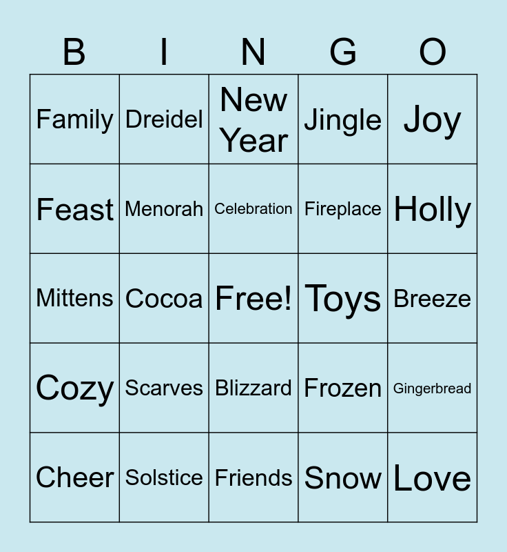 This bingo card has a free space and 34 words: Reindeer, Snow, Winter, Mistletoe, Cozy, Menorah, Joy, Cheer, Dreidel, Giving, Celebration, New Year, Tinsel, Candle, Toys, Holly, Solstice, Mittens, Scarves, Frozen, Blizzard, Tradition, Family, Breeze, Friends, Love, Jingle, Wonder, Fireplace, Feast, Peppermint, Cocoa, Gingerbread and Nutcracker.