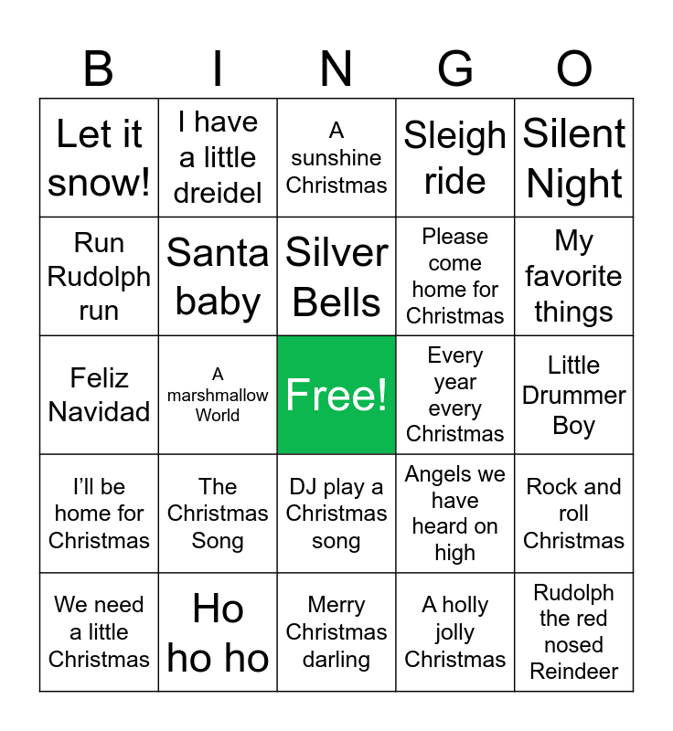 This bingo card has a free space and 78 words: I want a hippo for Christmas, Over the river and through the woods, A sunshine Christmas, Here comes saint Claus, Suzy snowflake, It’s beginning to look a lot like Christmas, All I want for Christmas is you, Rockin’ Around the Christmas Tree, It’s the most wonderful time of the year, Jingle Bell Rock, My two front teeth, White Christmas, Sleigh ride, Let it snow!, This Christmas, Run Rudolph run, Merry Christmas Baby, The Christmas Song, Little Saint Nick, Little Drummer Boy, You’re a mean one, Mr. Grinch, Silent Night, Feliz Navidad, Silver Bells, Santa baby, Frosty the snowman, Deck the Hall, Santa drives a hot rod, Joy to the world, 12 days of Christmas, My favorite things, Hard candy Christmas, Merry Christmas darling, The first noel, We need a little Christmas, Every year every Christmas, ‘Zat you Santa Claus?, Silver and gold, Have yourself a merry little Christmas, Rudolph the red nosed Reindeer, Do you want to build a snow man, I wish you a merry Christmas, Ave Maria, It came upon a midnight clear, Do you hear what I hear, I have a little dreidel, Mistletoe and holly, ’Twas the night before Christmas, Blue Christmas, Jingle bells, Rock and roll Christmas, A marshmallow World, Angels we have heard on high, What child is this, O holy night, I’m gettin’ nuttin’ for Christmas, O come all ye faithful, Hark the herald angels sing, Away in a manager, DJ play a Christmas song, Please come home for Christmas, Snoopy’s Christmas, Christmas in dixie, Santa Claus is coming to town, Cozy little Christmas, The chipmunk song, Let’s boogey to the elf dance, The Christmas waltz, I’ll be home for Christmas, Ho ho ho, Tennessee Christmas, There’s no place like home, Dominick the donkey, Baby it’s cold outside, A holly jolly Christmas, Winter Wonderland, I saw mommy kissing Santa Claus and Last Christmas.