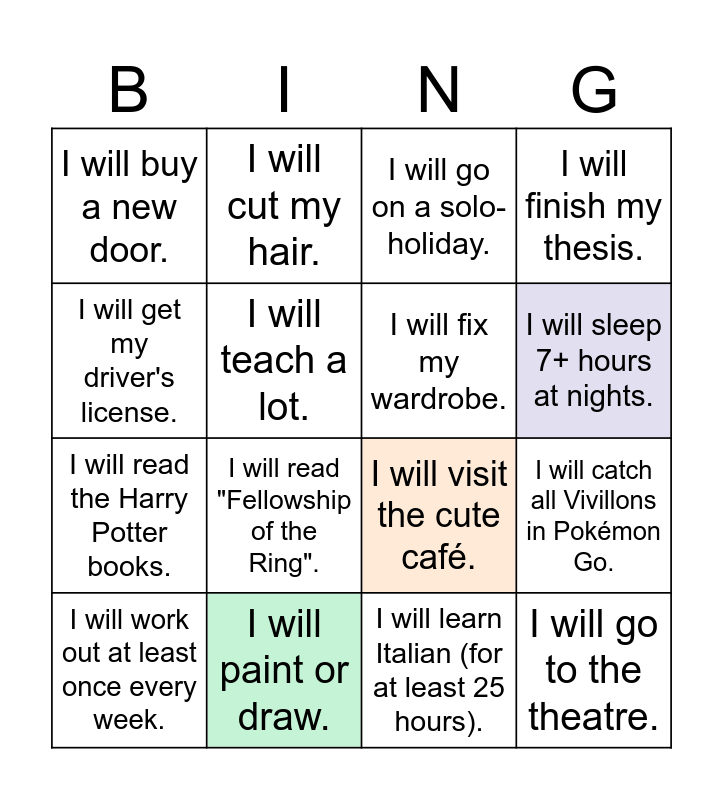 This bingo card has 16 words: I will paint or draw., I will catch all Vivillons in Pokémon Go., I will go on a solo-holiday., I will buy a new door., I will read the Harry Potter books., I will cut my hair., I will visit the cute café., I will learn Italian (for at least 25 hours)., I will get my driver's license., I will teach a lot., I will work out at least once every week., I will finish my thesis., I will read "Fellowship of the Ring"., I will sleep 7+ hours at nights., I will fix my wardrobe. and I will go to the theatre..