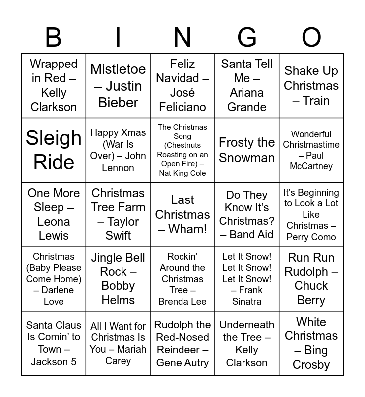 This bingo card has a free space and 24 words: Jingle Bell Rock – Bobby Helms, All I Want for Christmas Is You – Mariah Carey, The Christmas Song (Chestnuts Roasting on an Open Fire) – Nat King Cole, Santa Claus Is Comin’ to Town – Jackson 5, Shake Up Christmas – Train, Wrapped in Red – Kelly Clarkson, Sleigh Ride, Mistletoe – Justin Bieber, Do They Know It’s Christmas? – Band Aid, Rockin’ Around the Christmas Tree – Brenda Lee, Frosty the Snowman, One More Sleep – Leona Lewis, Let It Snow! Let It Snow! Let It Snow! – Frank Sinatra, Run Run Rudolph – Chuck Berry, Happy Xmas (War Is Over) – John Lennon, Underneath the Tree – Kelly Clarkson, It’s Beginning to Look a Lot Like Christmas – Perry Como, Feliz Navidad – José Feliciano, Wonderful Christmastime – Paul McCartney, Christmas Tree Farm – Taylor Swift, White Christmas – Bing Crosby, Christmas (Baby Please Come Home) – Darlene Love, Santa Tell Me – Ariana Grande and Rudolph the Red-Nosed Reindeer – Gene Autry.