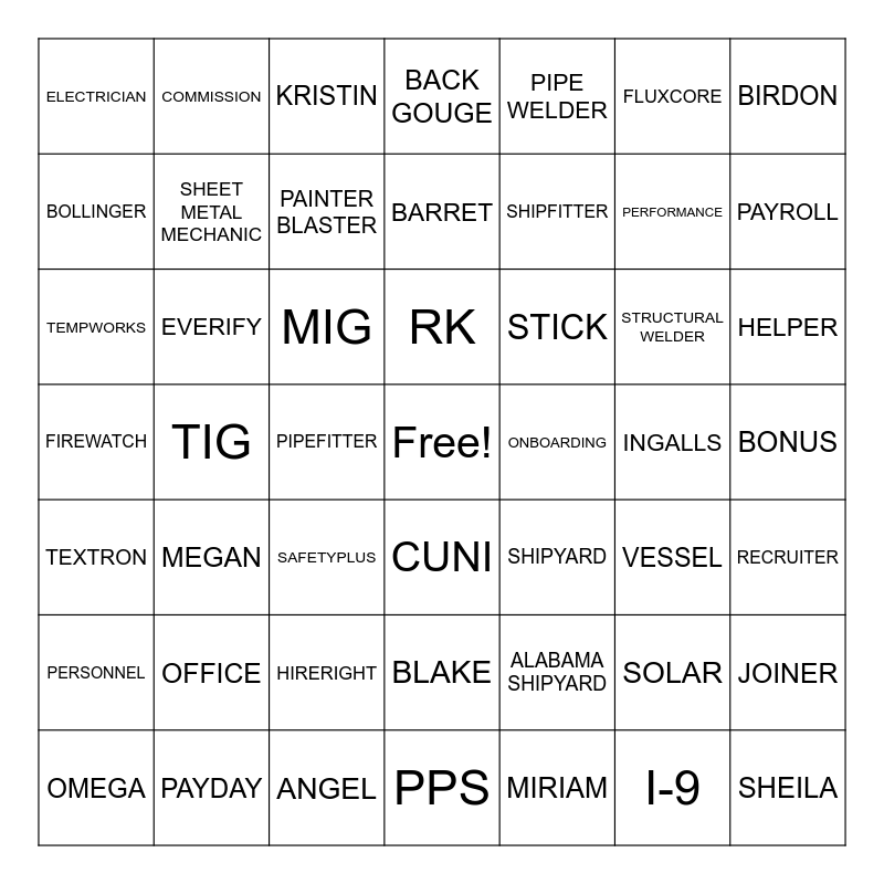 This bingo card has a free space and 48 words: ALABAMA SHIPYARD, PERFORMANCE, PPS, TIG, MIG, BONUS, COMMISSION, PAYDAY, FLUXCORE, CUNI, BIRDON, BACK GOUGE, STRUCTURAL WELDER, STICK, PERSONNEL, INGALLS, BOLLINGER, PAYROLL, SOLAR, PIPE WELDER, SHIPFITTER, PIPEFITTER, ELECTRICIAN, SHEET METAL MECHANIC, JOINER, PAINTER BLASTER, HELPER, OMEGA, RK, EVERIFY, I-9, ONBOARDING, RECRUITER, OFFICE, FIREWATCH, SHIPYARD, VESSEL, TEMPWORKS, SAFETYPLUS, HIRERIGHT, TEXTRON, SHEILA, KRISTIN, ANGEL, BARRET, BLAKE, MEGAN and MIRIAM.