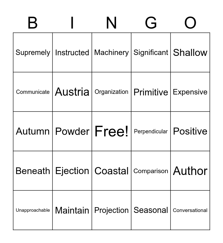 This bingo card has a free space and 48 words: Systematic, Conversational, Objection, Projection, Ejection, Programming, Instructed, August, Communicate, Operation, Austria, Significant, Author, Comparison, Awful, Continental, Organization, Perpendicular, Aboard, Shallow, Powder, Seasonal, Supremely, Primitive, Quietness, Expensive, Unapproachable, Objection, Coastal, Beneath, Tremendous, Curious, Display, Reference, Maintain, Powerful, Narrowly, Positive, Multiplication, Needle, Development, Dinosaur, Machinery, Restaurant, Autumn, Minerals, Daughter and Bicycle.