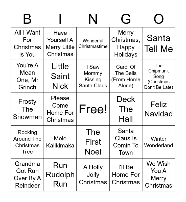 This bingo card has a free space and 44 words: O Holy Night, We Wish You A Merry Christmas, Dominick the Donkey, Grandma Got Run Over By A Reindeer, O Come All Ye Faithful, I'll Be Home For Christmas, Wonderful Christmastime, Sleigh Ride, Santa Tell Me, Run Rudolph Run, Merry Christmas, Happy Holidays, Deck The Hall, The First Noel, Mele Kalikimaka, Jingle Bell Rock, A Holly Jolly Christmas, Here Comes Santa Claus, Frosty The Snowman, You Make It Feel Like Christmas, The Chipmunk Song (Christmas Don't Be Late), Have Yourself A Merry Little Christmas, White Christmas, Jingle Bells, All I Want For Christmas Is You, Last Christmas, Feliz Navidad, The Christmas Song (Chestnuts Roasting On An Open Fire), Let It Snow!, Santa Claus Is Comin To Town, Rocking Around The Christmas Tree, Rudolph The Red-Nosed Reindeer, Winter Wonderland, It's The Most Wonderful Time Of The Year, Silver Bells, Please Come Home For Christmas, The Little Drummer Boy, Santa Baby, Mary, Did You Know?, I Saw Mommy Kissing Santa Claus, You're A Mean One, Mr Grinch, Carol Of The Bells (From Home Alone), Blue Christmas, Little Saint Nick and Christmas Time Is Here.