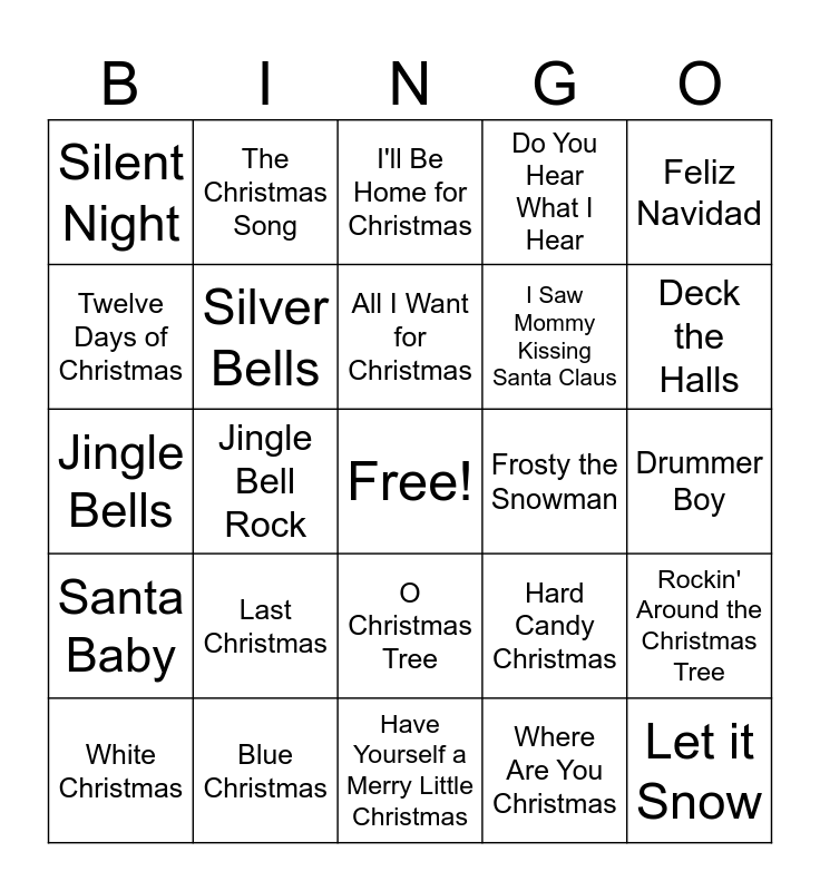 This bingo card has a free space and 24 words: Last Christmas, Blue Christmas, All I Want for Christmas, White Christmas, Feliz Navidad, Silent Night, Twelve Days of Christmas, The Christmas Song, Frosty the Snowman, O Christmas Tree, I Saw Mommy Kissing Santa Claus, Jingle Bells, Hard Candy Christmas, Rockin' Around the Christmas Tree, Silver Bells, Where Are You Christmas, Drummer Boy, I'll Be Home for Christmas, Deck the Halls, Jingle Bell Rock, Let it Snow, Santa Baby, Do You Hear What I Hear and Have Yourself a Merry Little Christmas.