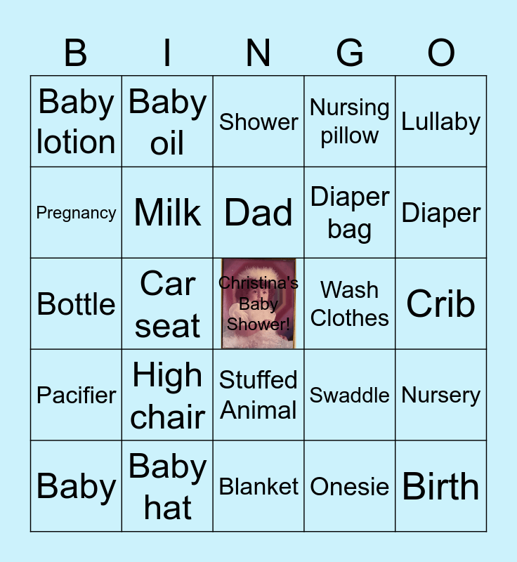 This bingo card has a free space and 29 words: Baby, Baby monitor, Car seat, Stroller, Baby lotion, Shower, Milk, High chair, Wash Clothes, Baby hat, Crib, Birth, Blanket, Onesie, Diaper, Boy, Stuffed Animal, Pacifier, Lullaby, Bottle, Swaddle, Bib, Diaper bag, Pregnancy, Nursing pillow, Baby oil, Nursery, Dad and Mom.