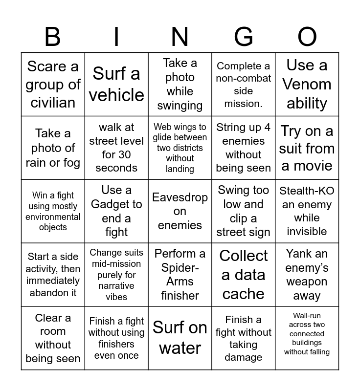 This bingo card has a free space and 24 words: Change suits mid-mission purely for narrative vibes, Finish a fight without using finishers even once, Web wings to glide between two districts without landing, Clear a room without being seen, Use a Venom ability, Scare a group of civilian, Take a photo of rain or fog, Surf a vehicle, Swing too low and clip a street sign, Perform a Spider-Arms finisher, String up 4 enemies without being seen, Win a fight using mostly environmental objects, Collect a data cache, Yank an enemy’s weapon away, walk at street level for 30 seconds, Finish a fight without taking damage, Stealth-KO an enemy while invisible, Take a photo while swinging, Try on a suit from a movie, Use a Gadget to end a fight, Wall-run across two connected buildings without falling, Start a side activity, then immediately abandon it, Complete a non-combat side mission. and Surf on water.