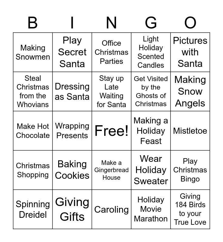 This bingo card has a free space and 29 words: Spinning Dreidel, Trimming the Tree, Wrapping Presents, Zoo Lights, Making Snowmen, Office Christmas Parties, Dressing as Santa, Baking Cookies, Making a Holiday Feast, Giving Gifts, Mistletoe, Giving 184 Birds to your True Love, Caroling, Holiday Movie Marathon, Making Snow Angels, Spending Time with Friends and Family, Make a Gingerbread House, Christmas Shopping, Pictures with Santa, Make Hot Chocolate, Wear Holiday Sweater, Make a Wreath, Get Visited by the Ghosts of Christmas, Steal Christmas from the Whovians, Light Holiday Scented Candles, Play Secret Santa, Play Christmas Bingo, Stay up Late Waiting for Santa and Be Festive.