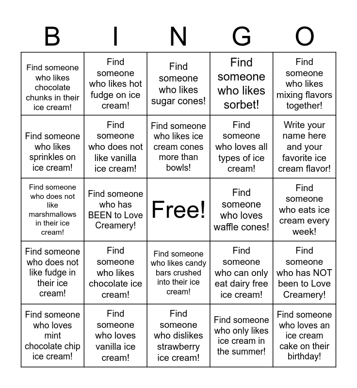This bingo card has a free space and 24 words: Find someone who likes chocolate ice cream!, Find someone who loves vanilla ice cream!, Find someone who likes ice cream cones more than bowls!, Find someone who loves mint chocolate chip ice cream!, Find someone who likes mixing flavors together!, Find someone who likes chocolate chunks in their ice cream!, Find someone who likes sprinkles on ice cream!, Find someone who likes hot fudge on ice cream!, Find someone who loves waffle cones!, Find someone who likes candy bars crushed into their ice cream!, Find someone who loves all types of ice cream!, Find someone who does not like marshmallows in their ice cream!, Find someone who can only eat dairy free ice cream!, Find someone who has NOT been to Love Creamery!, Find someone who does not like vanilla ice cream!, Find someone who only likes ice cream in the summer!, Find someone who eats ice cream every week!, Find someone who likes sugar cones!, Write your name here and your favorite ice cream flavor!, Find someone who has BEEN to Love Creamery!, Find someone who loves an ice cream cake on their birthday!, Find someone who does not like fudge in their ice cream!, Find someone who likes sorbet! and Find someone who dislikes strawberry ice cream!.