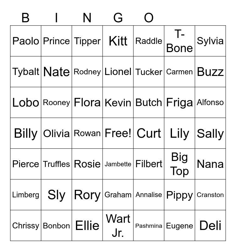 This bingo card has a free space and 388 words: Admiral, Agent S, Agnes, Al, Alfonso, Alice, Alli, Amelia, Anabelle, Anchovy, Angus, Anicotti, Ankha, Annalisa, Annalise, Antonio, Apollo, Apple, Astrid, Audie, Aurora, Ava, Avery, Axel, Baabara, Bam, Bangle, Barold, Bea, Beardo, Beau, Becky, Bella, Benedict, Benjamin, Bertha, Bettina, Bianca, Biff, Big Top, Bill, Billy, Biskit, Bitty, Blaire, Blanche, Bluebear, Bob, Bonbon, Bones, Boomer, Boone, Boots, Boris, Boyd, Bree, Broccolo, Broffina, Bruce, Bubbles, Buck, Bud, Bunnie, Butch, Buzz, Cally, Camofrog, Canberra, Candi, Carmen, Caroline, Carrie, Cashmere, Celia, Cesar, Chadder, Charlise, Cheri, Cherry, Chester, Chevre, Chief, Chops, Chow, Chrissy, Claude, Claudia, Clay, Cleo, Clyde, Coach, Cobb, Coco, Cole, Colton, Cookie, Cousteau, Cranston, Croque, Cube, Curlos, Curly, Curt, Cyd, Cyrano, Daisy, Deena, Deirdre, Del, Deli, Derwin, Diana, Diva, Dizzy, Dobie, Doc, Dom, Dora, Dotty, Drago, Drake, Drift, Ed, Egbert, Elise, Ellie, Elmer, Eloise, Elvis, Erik, Eugene, Eunice, Fang, Fauna, Felicity, Filbert, Flip, Flo, Flora, Flurry, Francine, Frank, Freckles, Freya, Friga, Frita, Frobert, Fuchsia, Gabi, Gala, Gaston, Gayle, Genji, Gigi, Gladys, Gloria, Goldie, Gonzo, Goose, Graham, Greta, Grizzly, Groucho, Gruff, Gwen, Hamlet, Hamphrey, Hans, Harry, Hazel, Henry, Hippeux, Hopkins, Hopper, Hornsby, Huck, Hugh, Iggly, Ike, Jacob, Jacques, Jambette, Jay, Jeremiah, Jitters, Joey, Judy, Julia, Julian, June, Kabuki, Katt, Keaton, Ken, Ketchup, Kevin, Kid Cat, Kidd, Kiki, Kitt, Kitty, Klaus, Knox, Kody, Kyle, Leonardo, Leopold, Lily, Limberg, Lionel, Lobo, Lolly, Lopez, Louie, Lucha, Lucky, Lucy, Lyman, Mac, Maddie, Maelle, Maggie, Mallary, Maple, Marcel, Marcie, Margie, Marina, Marshal, Mathilda, Megan, Melba, Merengue, Merry, Midge, Mint, Mira, Miranda, Mitzi, Moe, Molly, Monique, Monty, Moose, Mott, Muffy, Murphy, Nan, Nana, Nate, Nibbles, O'Hare, Octavian, Olaf, Olive, Olivia, Opal, Ozzie, Pancetti, Pango, Paolo, Papi, Pashmina, Pate, Paula, Peaches, Peanut, Pecan, Peck, Peewee, Peggy, Pekoe, Penelope, Phil, Phoebe, Pierce, Pietro, Pinky, Piper, Pippy, Plucky, Pompom, Poncho, Poppy, Portia, Prince, Puck, Puddles, Pudge, Punchy, Purrl, Queenie, Quillson, Raddle, Rasher, Raymond, Renée, Reneigh, Rex, Rhonda, Ribbot, Ricky, Rizzo, Roald, Robin, Rocco, Rocket, Rod, Rodeo, Rodney, Rolf, Rooney, Rory, Roscoe, Rosie, Rowan, Ruby, Rudy, Sally, Samson, Sandy, Savannah, Scoot, Shari, Sheldon, Shep, Sherb, Simon, Skye, Sly, Snake, Snooty, Soleil, Sparro, Spike, Spork, Sprinkle, Sprocket, Static, Stella, Sterling, Stinky, Stitches, Stu, Sydney, Sylvana, Sylvia, T-Bone, Tabby, Tad, Tammi, Tammy, Tangy, Tank, Tasha, Teddy, Tex, Tia, Tiffany, Timbra, Tipper, Tom, Truffles, Tucker, Tutu, Twiggy, Tybalt, Ursala, Velma, Vesta, Vic, Victoria, Violet, Vivian, Vladimir, Wade, Walker, Walt, Wart Jr., Weber, Wendy, Whitney, Willow, Winnie, Wolfgang, Yuka, Zell and Zucker.