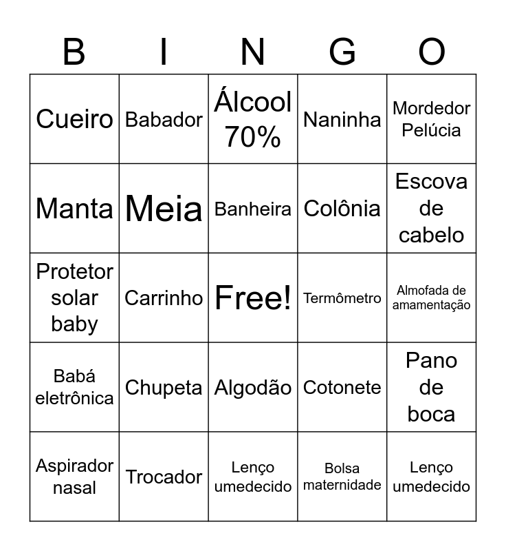 This bingo card has a free space and 51 words: Fralda, Lenço umedecido, Fralda, Lenço umedecido, Chupeta, Mamadeira, Babador, Body, Manta, Touca, Meia, Naninha, Pano de boca, Cotonete, Sabonete líquido, Shampoo, Banheira, Termômetro, Toalha de banho, Mordedor Pelúcia, Carrinho, Bolsa maternidade, Cueiro, Colônia, Paninho de ombro, Pomada de assadura, Escova de cabelo, Cortador de unha, Aspirador nasal, Álcool 70%, Fralda de pano, Macacão, Mijão, Sapatinho, Luva, Trocador, Porta leite em pó, Escova de mamadeira, Cabide, Móbile, Almofada de amamentação, Babá eletrônica, Pratinho, Colher de silicone, Copo de transição, Brinquedo de banho, Protetor solar baby, Repelente baby, Talco, Algodão and Prendedor de chupeta.