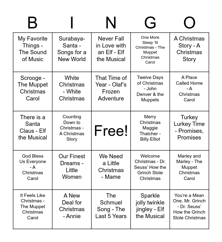 This bingo card has a free space and 30 words: A New Deal for Christmas - Annie, Twelve Days to Christmas - She Loves Me, Counting Down to Christmas - A Christmas Story, Have Yourself a Merry Little Christmas - Meet Me in St. Louis, My Favorite Things - The Sound of Music, Never Fall in Love with an Elf - Elf the Musical, White Christmas - White Christmas, We Need a Little Christmas - Mame, Merry Christmas Maggie Thatcher - Billy Elliot, The Schmuel Song - The Last 5 Years, Turkey Lurkey Time - Promises, Promises, You’re a Mean One, Mr. Grinch - Dr. Seuss’ How the Grinch Stole Christmas, Sparkle jolly twinkle jingley - Elf the Musical, Christmas is my Favorite Time of Year - Catch Me If You Can, A Place Called Home - A Christmas Carol, Snow - White Christmas, Welcome Christmas - Dr. Seuss’ How the Grinch Stole Christmas, God Bless Us Everyone - A Christmas Carol, Our Finest Dreams - Little Women, A Christmas Story - A Christmas Story, There is a Santa Claus - Elf the Musical, Count Your Blessings Instead of Sheep - White Christmas, Surabaya-Santa - Songs for a New World, Twelve Days of Christmas - John Denver & the Muppets, Scrooge - The Muppet Christmas Carol, One More Sleep ‘til Christmas - The Muppet Christmas Carol, Marley and Marley - The Muppet Christmas Carol, It Feels Like Christmas - The Muppet Christmas Carol, That Time of Year - Olaf’s Frozen Adventure and Ring in the Season - Olaf’s Frozen Adventure.
