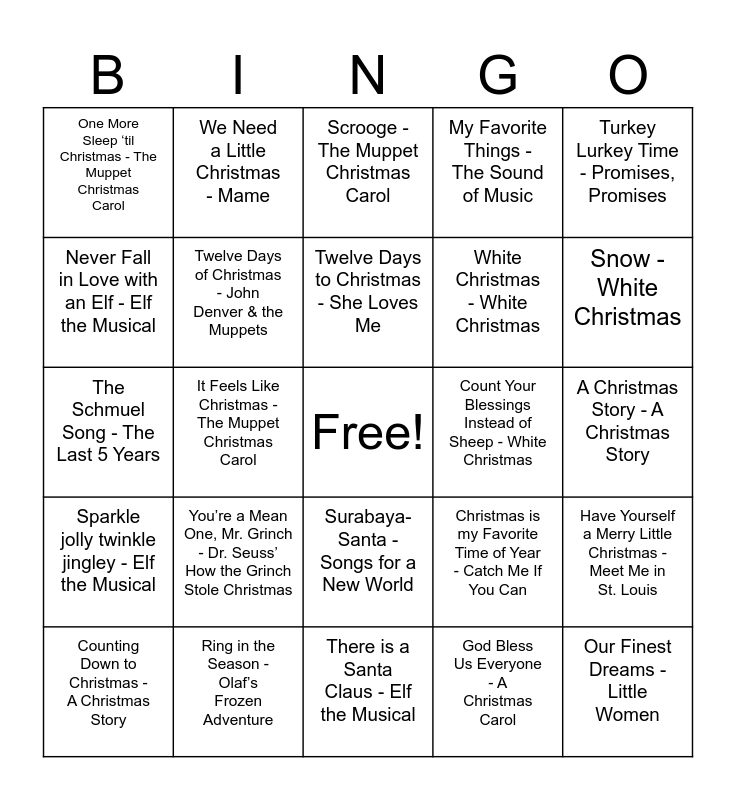This bingo card has a free space and 30 words: Ring in the Season - Olaf’s Frozen Adventure, That Time of Year - Olaf’s Frozen Adventure, It Feels Like Christmas - The Muppet Christmas Carol, Marley and Marley - The Muppet Christmas Carol, One More Sleep ‘til Christmas - The Muppet Christmas Carol, Scrooge - The Muppet Christmas Carol, Twelve Days of Christmas - John Denver & the Muppets, Surabaya-Santa - Songs for a New World, Count Your Blessings Instead of Sheep - White Christmas, There is a Santa Claus - Elf the Musical, A Christmas Story - A Christmas Story, Our Finest Dreams - Little Women, God Bless Us Everyone - A Christmas Carol, Welcome Christmas - Dr. Seuss’ How the Grinch Stole Christmas, Snow - White Christmas, A Place Called Home - A Christmas Carol, Christmas is my Favorite Time of Year - Catch Me If You Can, Sparkle jolly twinkle jingley - Elf the Musical, You’re a Mean One, Mr. Grinch - Dr. Seuss’ How the Grinch Stole Christmas, Turkey Lurkey Time - Promises, Promises, The Schmuel Song - The Last 5 Years, Merry Christmas Maggie Thatcher - Billy Elliot, We Need a Little Christmas - Mame, White Christmas - White Christmas, Never Fall in Love with an Elf - Elf the Musical, My Favorite Things - The Sound of Music, Have Yourself a Merry Little Christmas - Meet Me in St. Louis, Counting Down to Christmas - A Christmas Story, Twelve Days to Christmas - She Loves Me and A New Deal for Christmas - Annie.