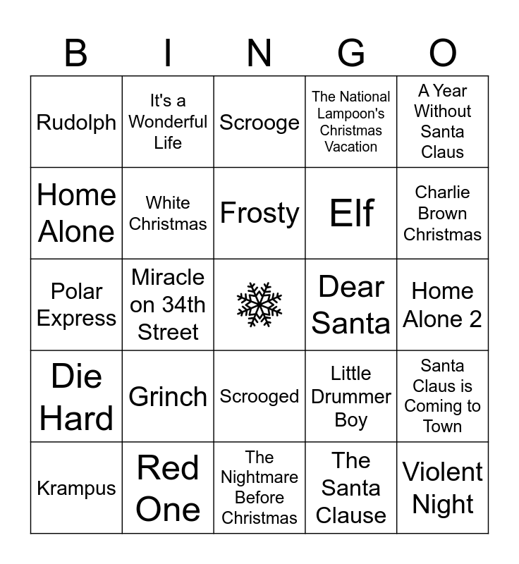 This bingo card has a free space and 24 words: Grinch, Red One, Frosty, Krampus, A Year Without Santa Claus, Rudolph, Home Alone, It's a Wonderful Life, Dear Santa, Scrooged, Elf, Polar Express, Little Drummer Boy, Santa Claus is Coming to Town, White Christmas, The Santa Clause, Home Alone 2, Scrooge, Charlie Brown Christmas, Miracle on 34th Street, Violent Night, Die Hard, The National Lampoon's Christmas Vacation and The Nightmare Before Christmas.