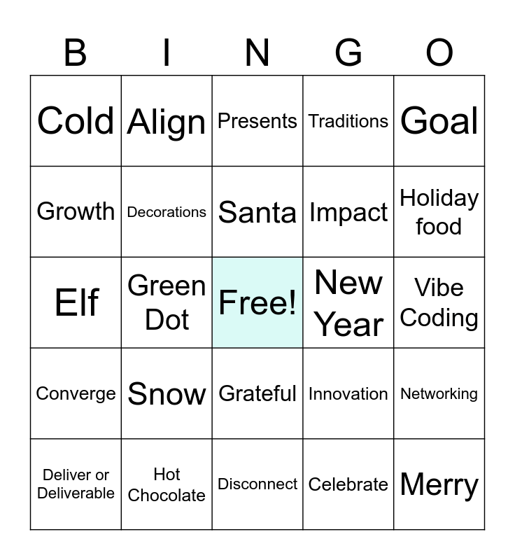 This bingo card has a free space and 24 words: Snow, Hot Chocolate, Santa, Deliver or Deliverable, Goal, Cold, Growth, Align, New Year, Grateful, Impact, Elf, Innovation, Networking, Decorations, Celebrate, Vibe Coding, Presents, Holiday food, Green Dot, Merry, Converge, Traditions and Disconnect.