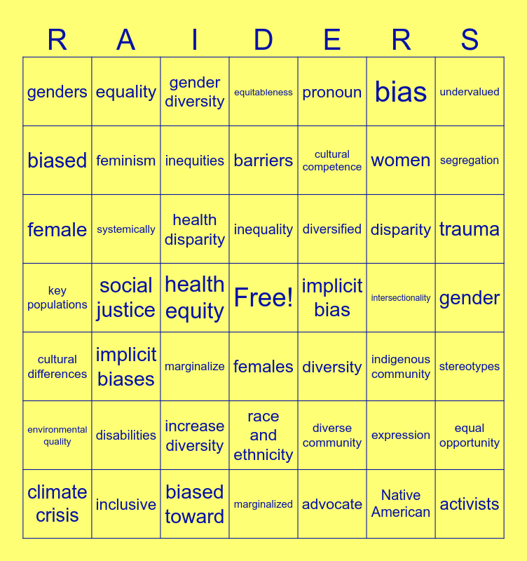 This bingo card has a free space and 156 words: accessible, activism, activists, advocacy, advocate, advocates, all-inclusive, allyship, anti-racism, antiracist, at risk, barrier, barriers, belong, bias, biased, biased toward, biases, biases towards, Black, clean energy, climate crisis, climate science, community diversity, community equity, confirmation bias, cultural competence, cultural differences, cultural heritage, cultural sensitivity, culturally appropriate, culturally responsive, DEI, disabilities, disability, discriminated, discrimination, discriminatory, disparity, diverse, diverse backgrounds, diverse communities, diverse community, diverse group, diverse groups, diversified, diversify, diversifying, diversity, enhance the diversity, enhancing diversity, environmental quality, equal opportunity, equality, equitable, equitableness, equity, ethnicity, excluded, exclusion, expression, female, females, feminism, fostering inclusivity, gender, gender diversity, gender identity, gender ideology, genders, Gulf of Mexico, hate speech, health disparity, health equity, hispanic minority, historically, identity, immigrants, implicit bias, implicit biases, inclusion, inclusive, inclusive leadership, inclusiveness, inclusivity, increase diversity, increase the diversity, indigenous community, inequalities, inequality, inequitable, inequities, inequity, injustice, institutional, intersectional, intersectionality, key groups, key people, key populations, Latinx, marginalize, marginalized, mental health, minorities, minority, most risk, multicultural, Native American, oppression, oppressive, orientation, polarization, political, pollution, prejudice, privilege, privileges, promote diversity, promoting diversity, pronoun, pronouns, race, race and ethnicity, racial, racial diversity, racial identity, racial inequality, racial justice, racially, racism, segregation, sense of belonging, social justice, sociocultural, socioeconomic, status, stereotype, stereotypes, systemic, systemically, trauma, traumatic, tribal, unconscious bias, underappreciated, underprivileged, underrepresentation, underrepresented, underserved, undervalued, victim, victims, vulnerable populations, women and women and underrepresented.