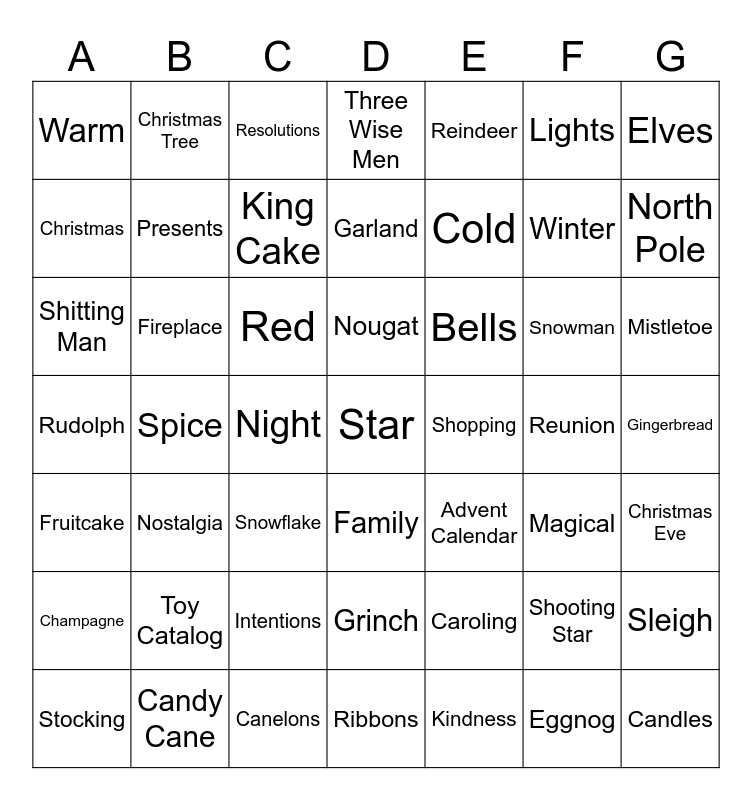This bingo card has 64 words: Santa Claus, Gingerbread, Snow, Snowman, Snowflake, Stocking, Christmas Tree, Caroling, Christmas, Candy Cane, Nougat, Caroling, Shitting Man, Reindeer, Jingle Bells, Lights, Cold, Warm, Hot Chocolate, Presents, Red, Fireplace, Three Wise Men, Nostalgia, Pine, Magical, Family, Secret Santa, Reunion, Champagne, Ornaments, Grinch, Caroling, Soup, King Cake, Mistletoe, Shooting Star, Night, Christmas Eve, Elves, Garland, North Pole, Sleigh, Mariah Carey, Canelons, Winter, Rudolph, Star, Bells, Ribbons, Eggnog, Candles, Spice, Fruitcake, Bonfire, Intentions, Resolutions, Letter, Advent Calendar, Toy Catalog, Kindness, Hallmark Movies, Shopping and Scarf.