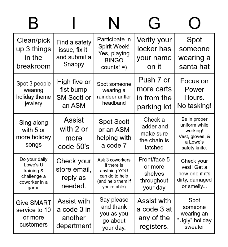 This bingo card has a free space and 24 words: Check your store email, reply as needed., Assist with a code 3 in another department, Spot someone wearing a raindeer antler headband, Give SMART service to 10 or more customers, Spot someone wearing a santa hat, Clean/pick up 3 things in the breakroom, Spot 3 people wearing holiday theme jewlery, Find a safety issue, fix it, and submit a Snappy, Check a ladder and make sure the chain is latched, Ask 3 coworkers if there is anything YOU can do to help (and help them if you're able), Push 7 or more carts in from the parking lot, Sing along with 5 or more holiday songs, Front/face 5 or more shelves throughout your day, Check your vest! Get a new one if it's dirty, damaged or smelly..., High five or fist bump SM Scott or an ASM, Assist with a code 3 at any of the registers., Be in proper uniform while working! Vest, gloves, & a Lowe's safety knife., Participate in Spirit Week! Yes, playing BINGO counts! =), Focus on Power Hours. No tasking!, Assist with 2 or more code 50's, Spot someone wearing an "Ugly" holiday sweater, Do your daily Lowe's U training & challenge a coworker in a game, Verify your locker has your name on it and Say please and thank you as you go about your day..