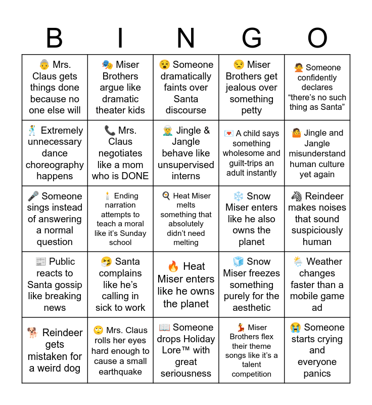 This bingo card has a free space and 24 words: π€§ Santa complains like heβs calling in sick to work, π Mrs. Claus rolls her eyes hard enough to cause a small earthquake, π§ββοΈ Jingle & Jangle behave like unsupervised interns, π Reindeer gets mistaken for a weird dog, π Someone confidently declares βthereβs no such thing as Santaβ, π΅ Mrs. Claus gets things done because no one else will, πΊ Extremely unnecessary dance choreography happens, π Miser Brothers argue like dramatic theater kids, βοΈ Snow Miser enters like he also owns the planet, π₯ Heat Miser enters like he owns the planet, π A child says something wholesome and guilt-trips an adult instantly, π€ Someone sings instead of answering a normal question, π§ Snow Miser freezes something purely for the aesthetic, π¦οΈ Weather changes faster than a mobile game ad, π Mrs. Claus negotiates like a mom who is DONE, π Miser Brothers flex their theme songs like itβs a talent competition, π¦ Reindeer makes noises that sound suspiciously human, π΅ Someone dramatically faints over Santa discourse, π€· Jingle and Jangle misunderstand human culture yet again, π―οΈ Ending narration attempts to teach a moral like itβs Sunday school, π Someone starts crying and everyone panics, π° Public reacts to Santa gossip like breaking news, π Miser Brothers get jealous over something petty and π Someone drops Holiday Loreβ’ with great seriousness.