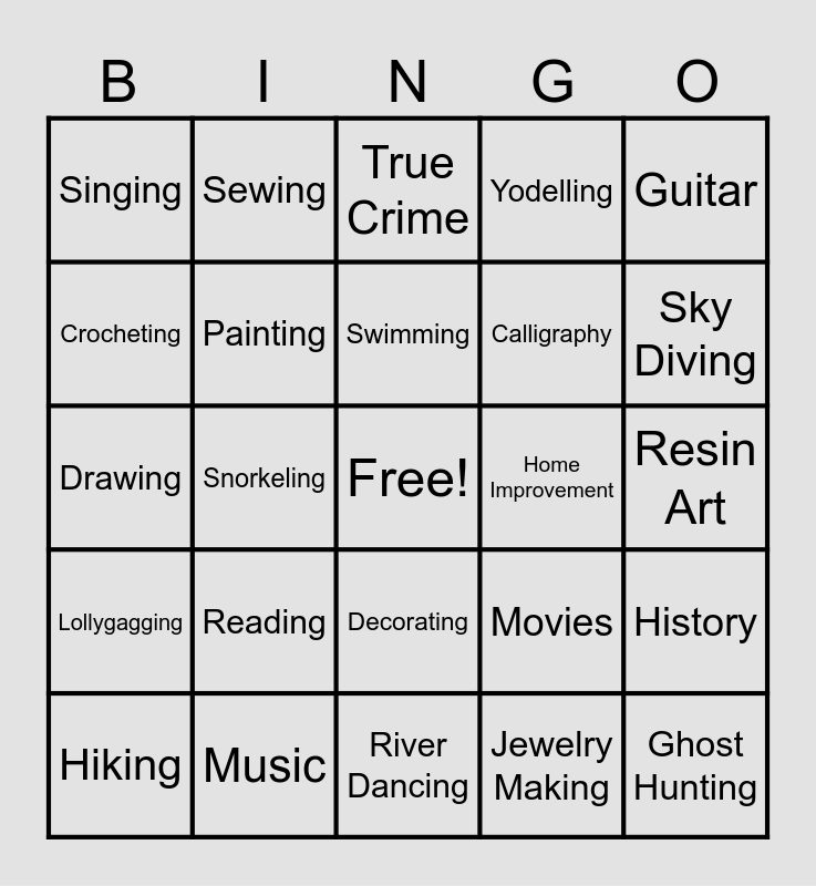 This bingo card has a free space and 24 words: Reading, Music, Swimming, Hiking, Guitar, Singing, Crocheting, Sewing, Home Improvement, Decorating, Calligraphy, Drawing, Movies, History, Painting, Jewelry Making, Resin Art, True Crime, Sky Diving, Snorkeling, Ghost Hunting, Lollygagging, Yodelling and River Dancing.