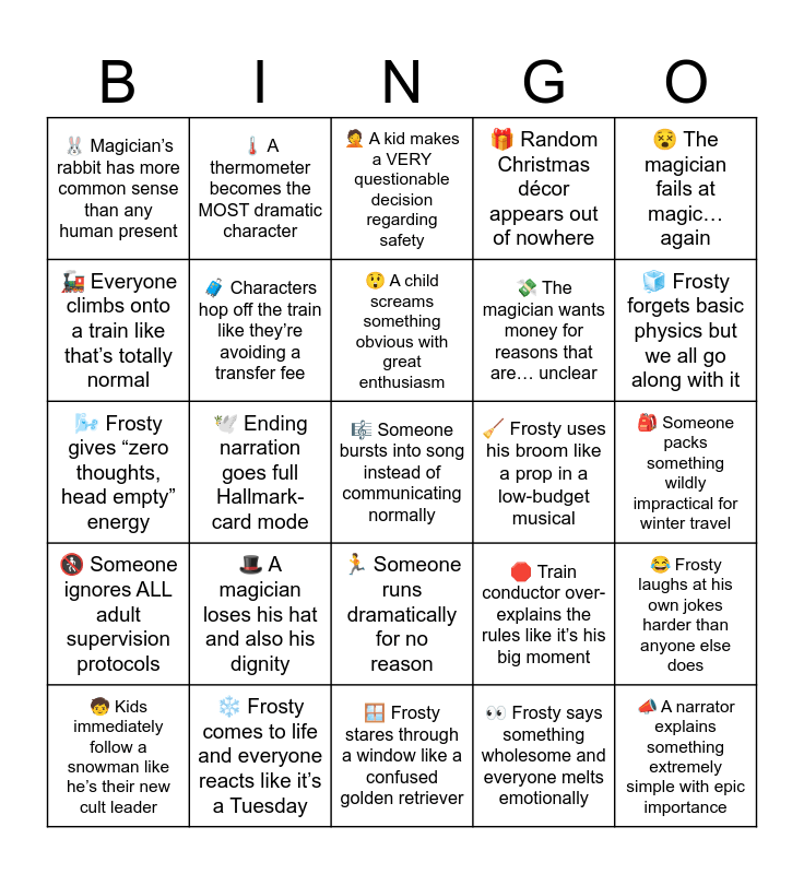 This bingo card has a free space and 24 words: 🎩 A magician loses his hat and also his dignity, ❄️ Frosty comes to life and everyone reacts like it’s a Tuesday, 😲 A child screams something obvious with great enthusiasm, 🧒 Kids immediately follow a snowman like he’s their new cult leader, 😵 The magician fails at magic… again, 🐰 Magician’s rabbit has more common sense than any human present, 🚂 Everyone climbs onto a train like that’s totally normal, 🌡️ A thermometer becomes the MOST dramatic character, 🧹 Frosty uses his broom like a prop in a low-budget musical, 🏃 Someone runs dramatically for no reason, 💸 The magician wants money for reasons that are… unclear, 🌬️ Frosty gives “zero thoughts, head empty” energy, 🛑 Train conductor over-explains the rules like it’s his big moment, 😂 Frosty laughs at his own jokes harder than anyone else does, 🧳 Characters hop off the train like they’re avoiding a transfer fee, 👀 Frosty says something wholesome and everyone melts emotionally, 🎒 Someone packs something wildly impractical for winter travel, 🤦 A kid makes a VERY questionable decision regarding safety, 🧊 Frosty forgets basic physics but we all go along with it, 🕊️ Ending narration goes full Hallmark-card mode, 📣 A narrator explains something extremely simple with epic importance, 🚷 Someone ignores ALL adult supervision protocols, 🎁 Random Christmas décor appears out of nowhere and 🪟 Frosty stares through a window like a confused golden retriever.
