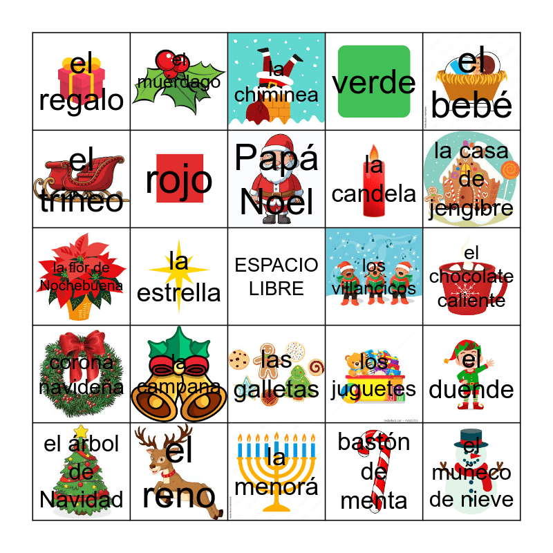 This bingo card has 24 images, a free space and 24 words: la campana, el reno, Papá Noel, el árbol de Navidad, el bebé, el regalo, el trineo, el muérdago, los villancicos, las galletas, la candela, la flor de Nochebuena, los juguetes, el duende, rojo, bastón de menta, el chocolate caliente, la chiminea, la casa de jengibre, la estrella, el muñeco de nieve, corona navideña, verde and la menorá.