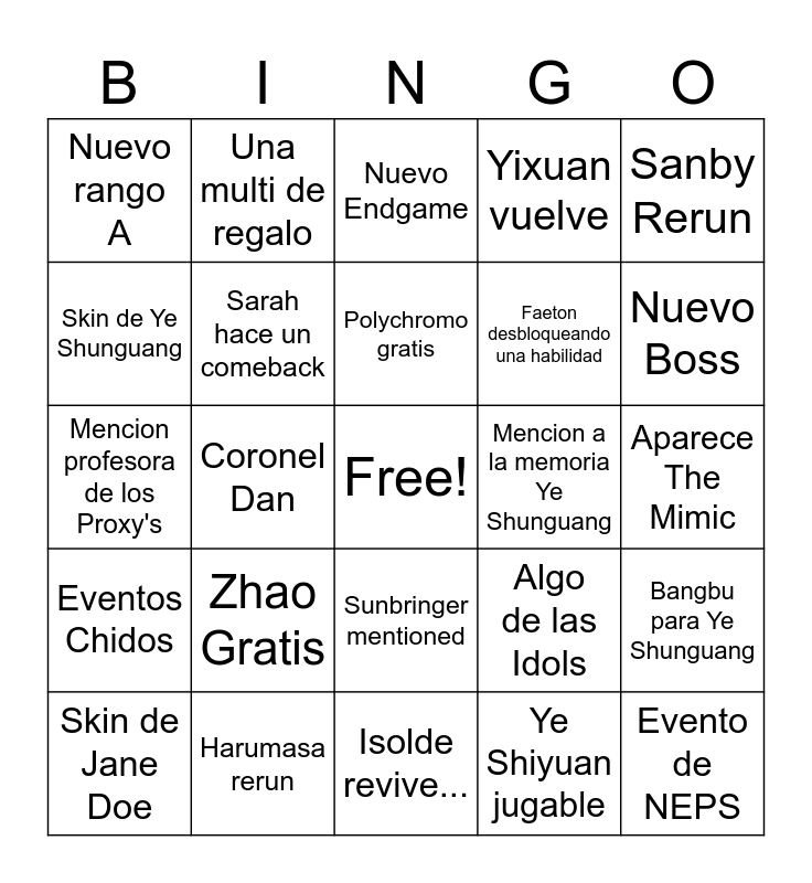 This bingo card has a free space and 24 words: Zhao Gratis, Harumasa rerun, Polychromo gratis, Skin de Jane Doe, Sanby Rerun, Nuevo rango A, Skin de Ye Shunguang, Una multi de regalo, Mencion a la memoria Ye Shunguang, Sunbringer mentioned, Faeton desbloqueando una habilidad, Mencion profesora de los Proxy's, Algo de las Idols, Bangbu para Ye Shunguang, Sarah hace un comeback, Ye Shiyuan jugable, Aparece The Mimic, Nuevo Endgame, Nuevo Boss, Coronel Dan, Evento de NEPS, Eventos Chidos, Yixuan vuelve and Isolde revive....