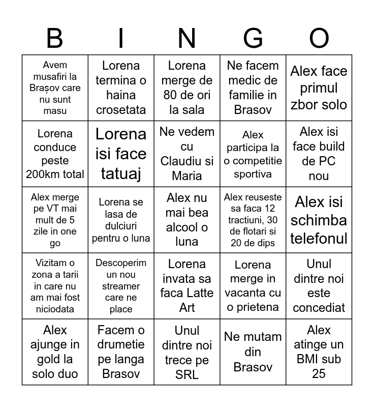 This bingo card has 25 words: Descoperim un nou streamer care ne place, Unul dintre noi trece pe SRL, Ne vedem cu Claudiu si Maria, Alex ajunge in gold la solo duo, Alex face primul zbor solo, Avem musafiri la Brașov care nu sunt masu, Lorena conduce peste 200km total, Lorena termina o haina crosetata, Alex reuseste sa faca 12 tractiuni, 30 de flotari si 20 de dips, Lorena invata sa faca Latte Art, Alex participa la o competitie sportiva, Alex merge pe VT mai mult de 5 zile in one go, Lorena merge in vacanta cu o prietena, Unul dintre noi este concediat, Lorena isi face tatuaj, Alex atinge un BMI sub 25, Alex isi schimba telefonul, Lorena merge de 80 de ori la sala, Alex isi face build de PC nou, Lorena se lasa de dulciuri pentru o luna, Alex nu mai bea alcool o luna, Facem o drumetie pe langa Brasov, Vizitam o zona a tarii in care nu am mai fost niciodata, Ne facem medic de familie in Brasov and Ne mutam din Brasov.