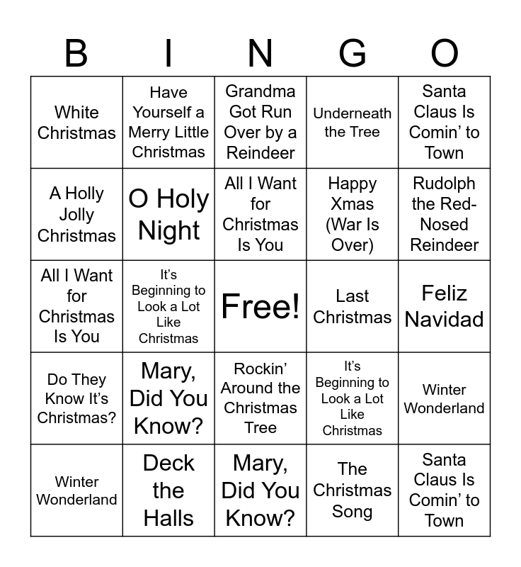 This bingo card has a free space and 64 words: Jingle Bells, Silent Night, Rudolph the Red-Nosed Reindeer, Winter Wonderland, Let It Snow, The Christmas Song, Have Yourself a Merry Little Christmas, O Holy Night, All I Want for Christmas Is You, Last Christmas, Rockin’ Around the Christmas Tree, Jingle Bell Rock, Feliz Navidad, Santa Claus Is Comin’ to Town, Deck the Halls, A Holly Jolly Christmas, It’s Beginning to Look a Lot Like Christmas, White Christmas, I Saw Mommy Kissing Santa Claus, Happy Xmas (War Is Over), Mary, Did You Know?, Do They Know It’s Christmas?, Underneath the Tree, Mistletoe, Grandma Got Run Over by a Reindeer, We Wish You a Merry Christmas, The First Noel, Little Drummer Boy, Blue Christmas, Christmas Wrapping, Sleigh Ride, Carol of the Bells, Jingle Bells, Silent Night, Rudolph the Red-Nosed Reindeer, Winter Wonderland, Let It Snow, The Christmas Song, Have Yourself a Merry Little Christmas, O Holy Night, All I Want for Christmas Is You, Last Christmas, Rockin’ Around the Christmas Tree, Jingle Bell Rock, Feliz Navidad, Santa Claus Is Comin’ to Town, Deck the Halls, A Holly Jolly Christmas, It’s Beginning to Look a Lot Like Christmas, White Christmas, I Saw Mommy Kissing Santa Claus, Happy Xmas (War Is Over), Mary, Did You Know?, Do They Know It’s Christmas?, Underneath the Tree, Mistletoe, Grandma Got Run Over by a Reindeer, We Wish You a Merry Christmas, The First Noel, Little Drummer Boy, Blue Christmas, Christmas Wrapping, Sleigh Ride and Carol of the Bells.